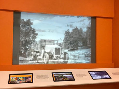 The Showcase features interactive touch screens that illustrate and dive into the rich citrus growing heritage of Redlands. This wall projection shows a photo of the historic grove truck. And beyond the screen is a surprise reveal!